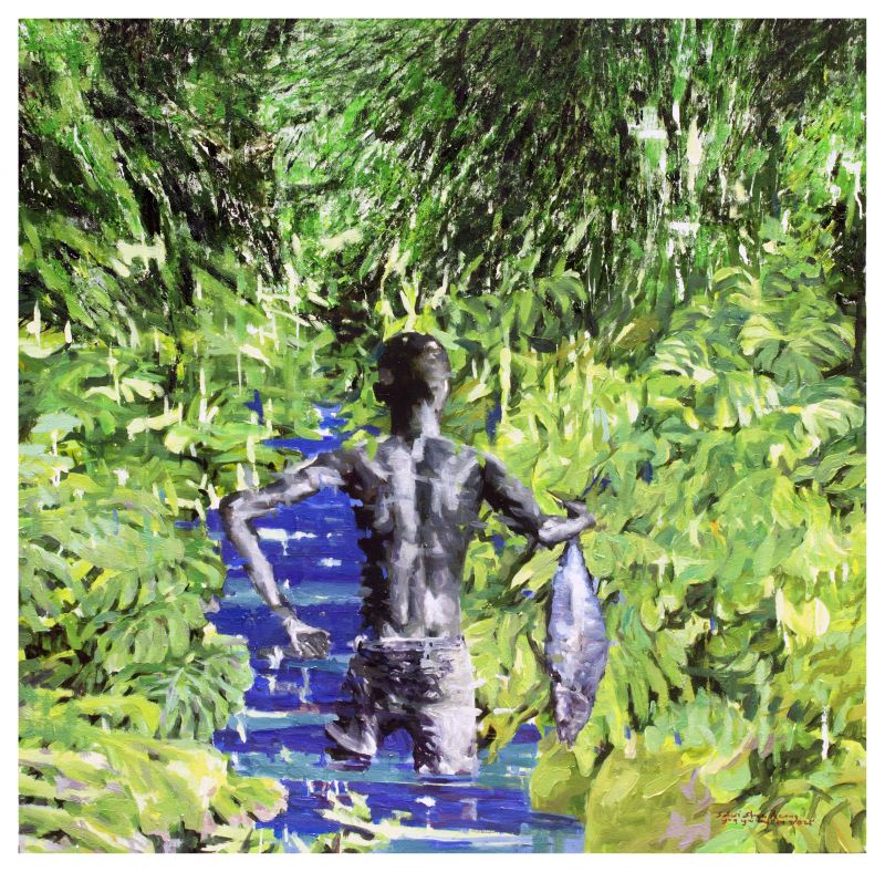 In Paradise, S. Dwi Stya Acong situates a solitary figure waist-deep in water, surrounded by dense, almost overwhelming greenery. The figure turns away from us, holding a freshly caught fish — a quiet yet powerful gesture of sustenance and survival.
