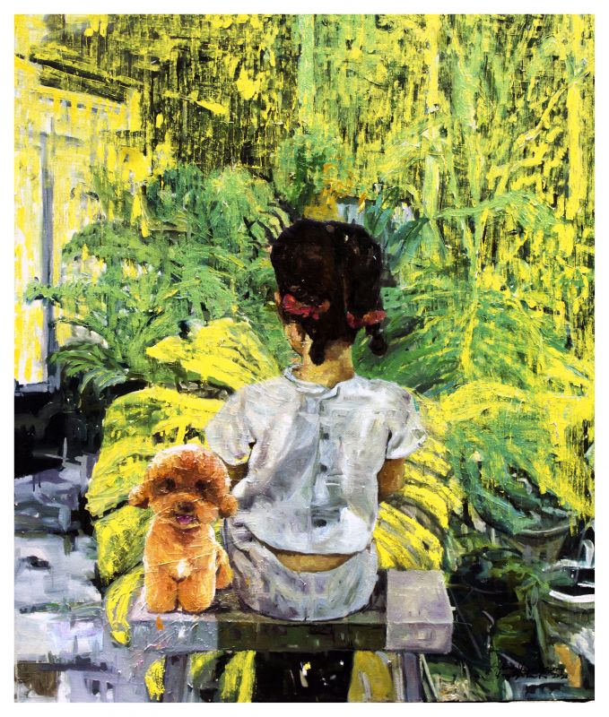 Two presences sit side by side — a young girl and a small dog — both facing away from the viewer. Their backs become the emotional center of the painting.