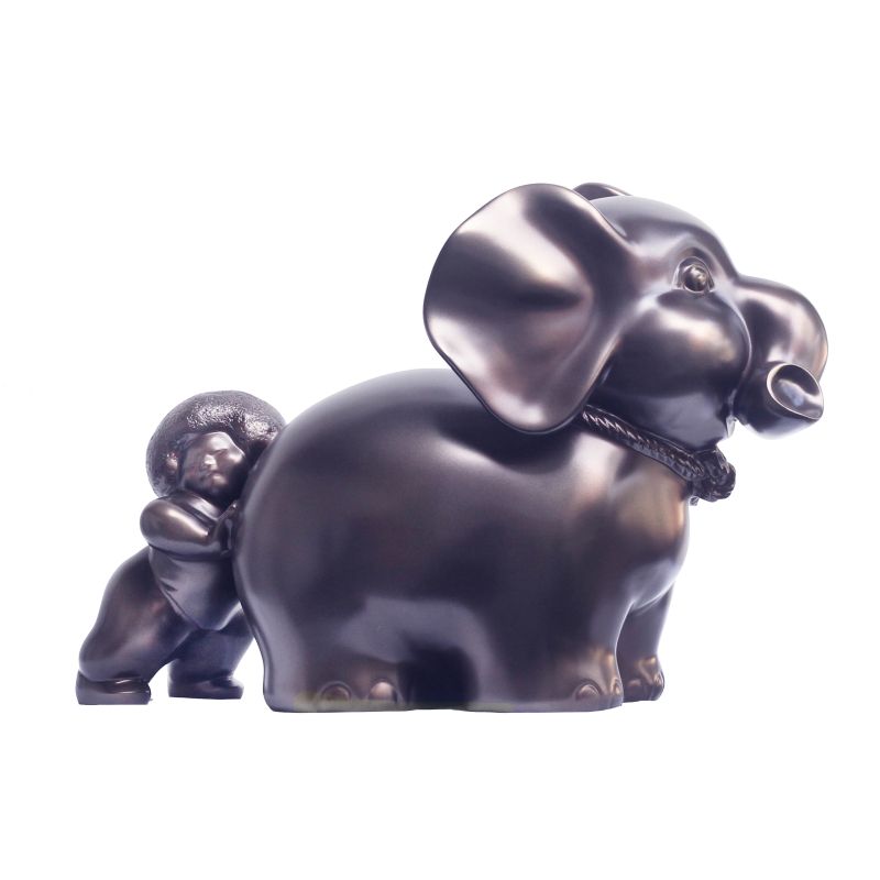 Adi Gunawan’s "Dorong Gajah," or "Push The Elephant," presents a delightful bronze sculpture that speaks to themes of perseverance and the power of seemingly small efforts. In this charming scene, a signature rounded figure of Gunawan's design earnestly attempts to push a significantly larger elephant. The smooth, polished surfaces of both figures highlight the artist's characteristic style, imbuing the moment with a sense of playful determination. This work resonates with the spirit of overcoming challenges, a sentiment often valued in Singapore's dynamic environment. It suggests that even when faced with seemingly insurmountable tasks, consistent effort and unwavering spirit can lead to progress. Gunawan’s endearing portrayal transforms a potentially arduous act into a heartwarming testament to the strength found in persistent endeavor and the possibility of achieving the unexpected.