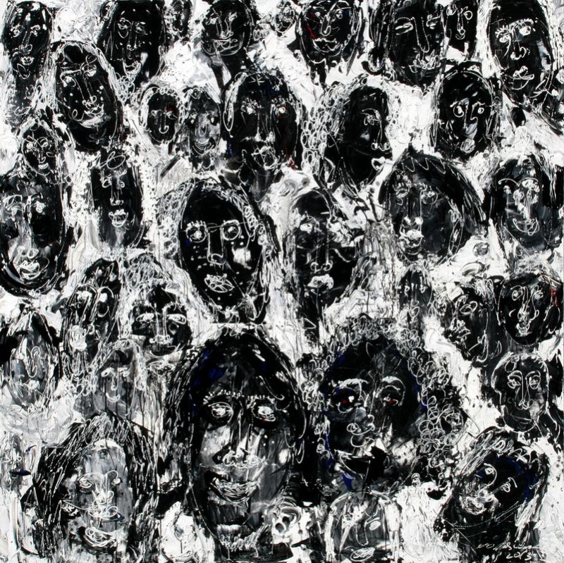 A haunting piece brought to life by its negative spacing and color deprivation, striking memory lies behind its depiction. Each face holding a story of its own, the artist employs offers both meaning and abstract interpretation, while leaving a lasting impression on the viewers mind. Defiant strokes bring to mind explosive and powerful emotion, arresting attention and commanding the viewer to stop, stare and contemplate what may lie behind it.