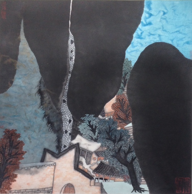 Born in Shandong, China in 1983, Guo Huawei graduated from the Faculty of Painting at the China Central Academy of Fine Arts in 2007 with a Master's Degree. He currently resides and works in Beijing, where he has gained considerable attention in recent years for his unique and current take on Chinese ink painting. By mixing the gentle fluidity of his chosen medium with the lineal, dreamlike quality of his style, Guo has in fact revisited the original intention of Chinese landscape painting, which is to inspire viewers to feel the subject matter rather than look at it. The polychromatic palette and textured look of Guo's works are considered anomalous for traditional ink landscapes, but also create a more clearly delineated compositional framework for his paintings. Aside from his graceful depiction of smoky, surrealistic mountainous regions, Guo occasionally features abstract shapes and patterns of colour that endow his works with an otherworldly beauty.