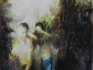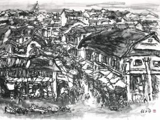 Vegetable grocers displayed in beautiful order as illustrated. It is the old Singapore where selling fresh produce is a staple to sustain survival. Figures from young to old could demonstrate the importance of family in participating in the business of selling, hence Sim has incorporated Chinese ink to pay homage to traditions and ideal family values.