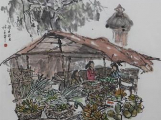 This ink wash painting by Lim Tze Peng, a renowned Singaporean artist, beautifully captures a scene of everyday life nestled within a tropical landscape. A grove of palm trees, rendered with the artist's characteristic calligraphic brushwork, dominates the composition, their fronds creating a sense of depth and movement. Beneath the canopy, human figures are engaged in daily activities, perhaps laundry or tending to a shrine, suggesting a harmonious coexistence between nature and human life. Lim Tze Peng masterfully employs ink in varying concentrations to create tonal variations and an impressionistic atmosphere, capturing the essence of the scene rather than minute details. While primarily monochromatic, subtle touches of color, like the red of a shirt, add visual interest. This artwork evokes a sense of tranquility and nostalgia, inviting viewers to appreciate the beauty of ordinary moments within the natural world. The architectural elements and laundry hint at the intersection of urban life and nature, a recurring theme in Lim Tze Peng's oeuvre. Through his distinctive style, he masterfully blends traditional Chinese ink painting techniques with a uniquely Singaporean perspective.