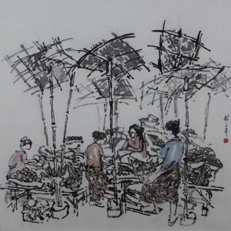 This painting by Lim Tze Peng beautifully captures a nostalgic moment in Bali, focusing on the simplicity of daily life. The intricately rendered details of stall owners roasting chestnuts evoke a sense of warmth and community. The women in colorful sarongs, engaged in lively trade, reflect the vibrant culture and traditions that have endured through time. They engaged in their trade under thatched roofs reminiscent of days gone past – the scene itself is evocative and nostalgic.