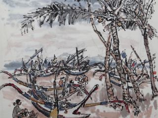 The artist's mastery of ink wash creates a tonal range that gives the painting a sense of depth and atmosphere. Buildings are in the back round fading in the background to show distance. The right side of the painting has chinese text written vertically, to help add to the seen of the market place. The artwork captures a fleeting moment of daily life, emphasizing the vibrancy of the urban environment. Lim Tze Peng's ability to evoke a sense of place with minimal detail is a hallmark of his style.
