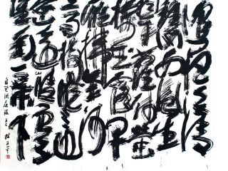 Lim Tze Peng writes the characters of 卜算子詠梅 or Ode to the Plum Blossom by Lu You (1125-1210) - a famous Song Dynasty poet and government official. The poem reads: 驿外断桥边,寂寞开无主。已是黄昏独自愁,更著风和雨. 无意苦争春,一任群芳妒。零落成泥碾作尘,只有香如故。 It translates to: Near the broken bridge outside the fortress I go, lonely and disoriented. It is already dusk and I am alone and anxious, more so when the wind and rain start to blow. I do not mean to fight for Spring, I would rather be alone and envied by the crowd. I will fall, become earth, be crushed to dust. My glory will be the same as before. The poem addresses the loneliness of the Plum Blossom which thrives in winter when other plants fail and is a symbol of resilience and perseverance in Chinese culture. In the same vein, the poet Lu You felt gloomy and disappointed with his corrupt fellow officials. He would rather forge a path on his own and be envied and excluded by the others, remaining steadfast to his beliefs.