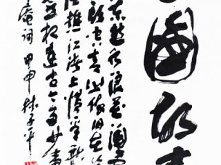 Lim Tze Peng writes the first line 谁家亭子傍西湾 of the poem 秋山林木 or the Mountains and Forests of Autumn by Yuan Dynasty landscape painter and poet Huang Gong Wang. The entire poem reads: 谁家亭子傍西湾,高树抉疏出石间。落叶尽随溪雨去,只留秋色满空山。 Translated, it reads: To whose family does the pavilion bordering West Bay belong, tall trees are scattered amongst the rocks. Falling leaves are swept away by creek and rain water, leaving only autumn colours that fill the empty mountains.