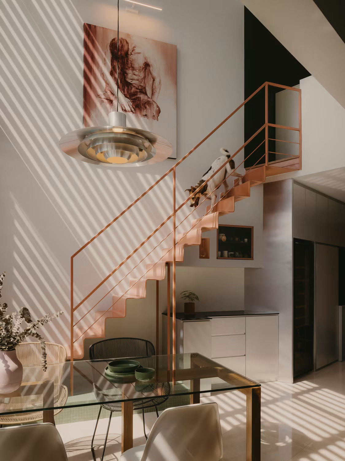 When our client first acquired Dou Rong Jun’s Contemplation from us for her previous home, her numerologist was shocked. “It’s the wrong painting for the living room – very depressing; it’s not good for your luck,” he warned. Yet she was drawn to the introspective figure and the strength in his hand, and the painting remained. Today, it hangs prominently above the metal staircase in her new double-volume apartment, accompanied by carefully positioned red packets—a nod to traditional feng shui. The peach-pink hue of the painting inspired the staircase and shelving beneath it, reflecting her love of colour throughout the home.Art is central to this apartment’s personality.